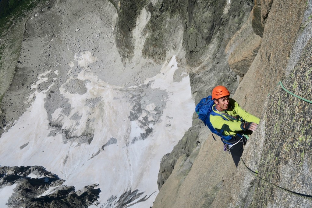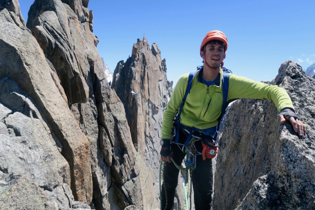 Merci Théo de m’avoir laissé grimper LA longueur en tête, pour prendre LA photo classique du Pilier Charmoz…
