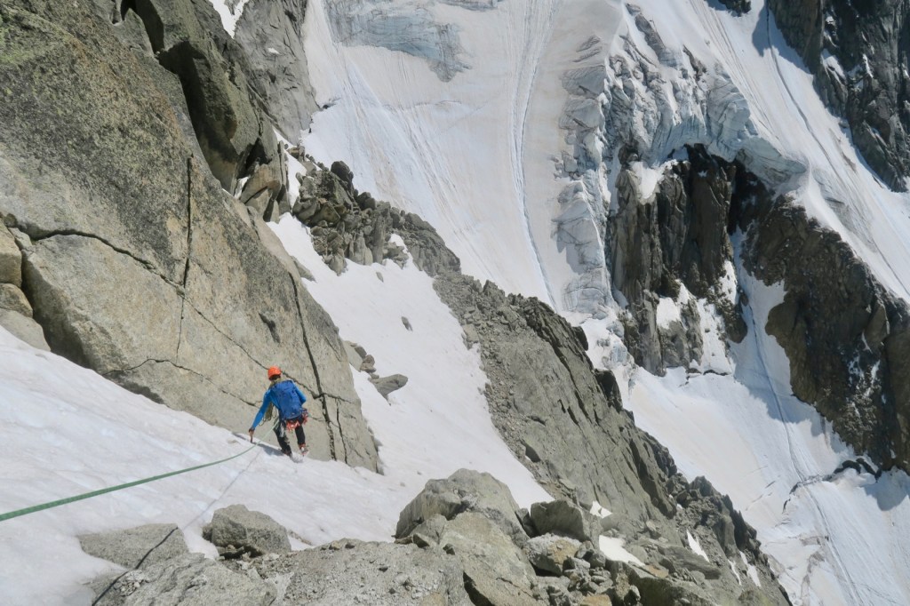 On repasse donc en mode alpiniste pour traverser la vire en direction du couloir Charmoz-Grépon. Ca se fait super bien, le couloir est sec mais pas trop de chutes de pierre, on le rejoint assez bas. Bingo, tout en traversée descendante et avec juste un petit rappel pour passer la rimaye, on rejoint le glacier des nantillons en a peine 20 min.