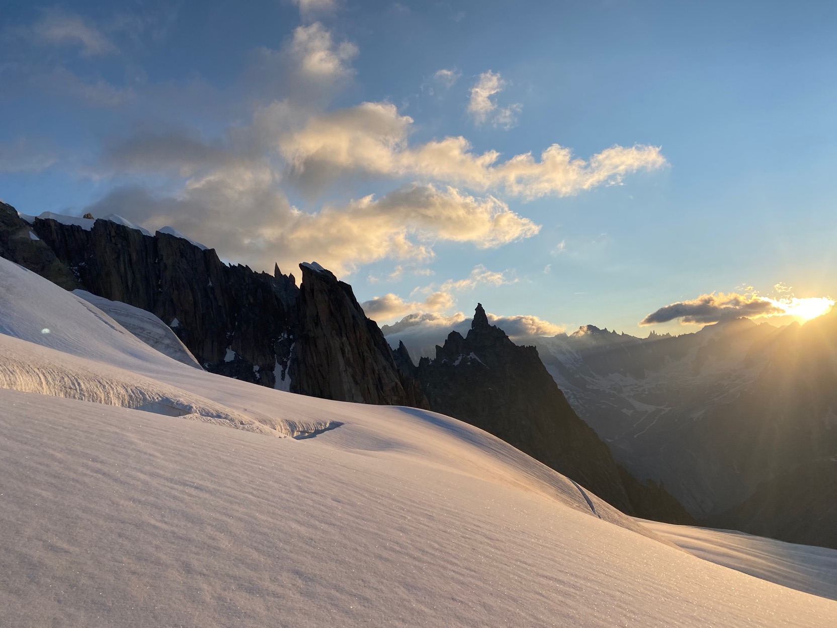 Après une première journée à la voie des Francais au Pouce, et une belle séance de fissure dans Police des Glaciers à la pointe Adolphe Rey, nous passons la nuit au Refuge des Cosmiques pour profiter de bonnes conditions de neige pour l’accès glaciaire.