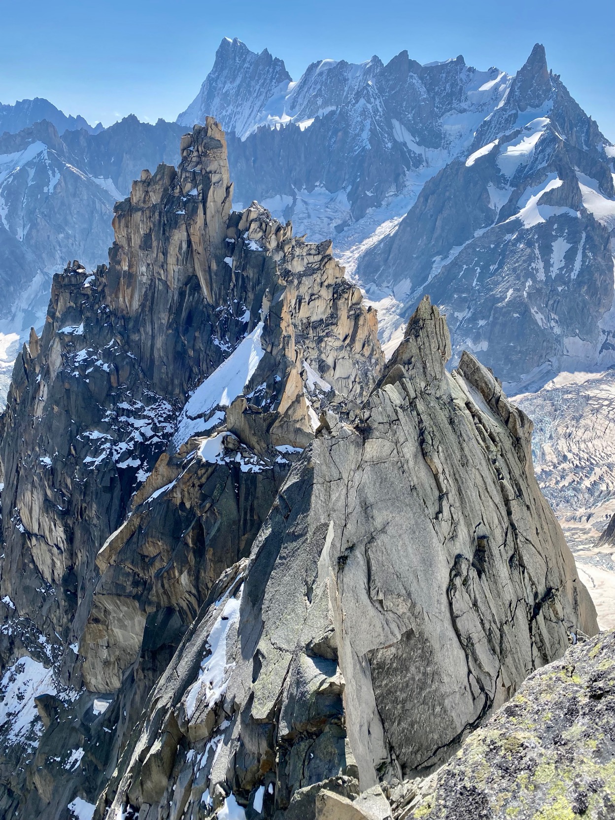 Pour monter au sommet du Pain de sucre nous avons suivi un cheminement tantôt sur le fil, tantôt face nord, avec quelques pas bien impressionnants, et une vue sur les Aiguilles de Chamonix somptueuse.
