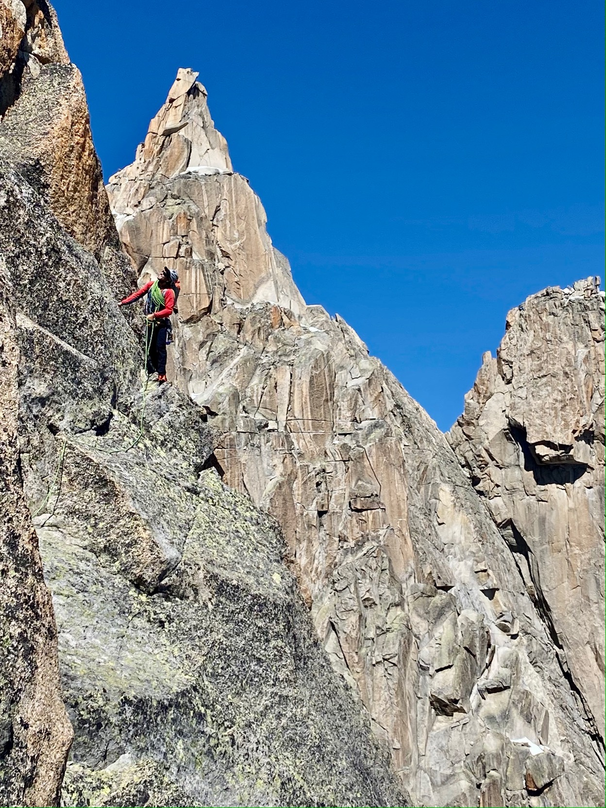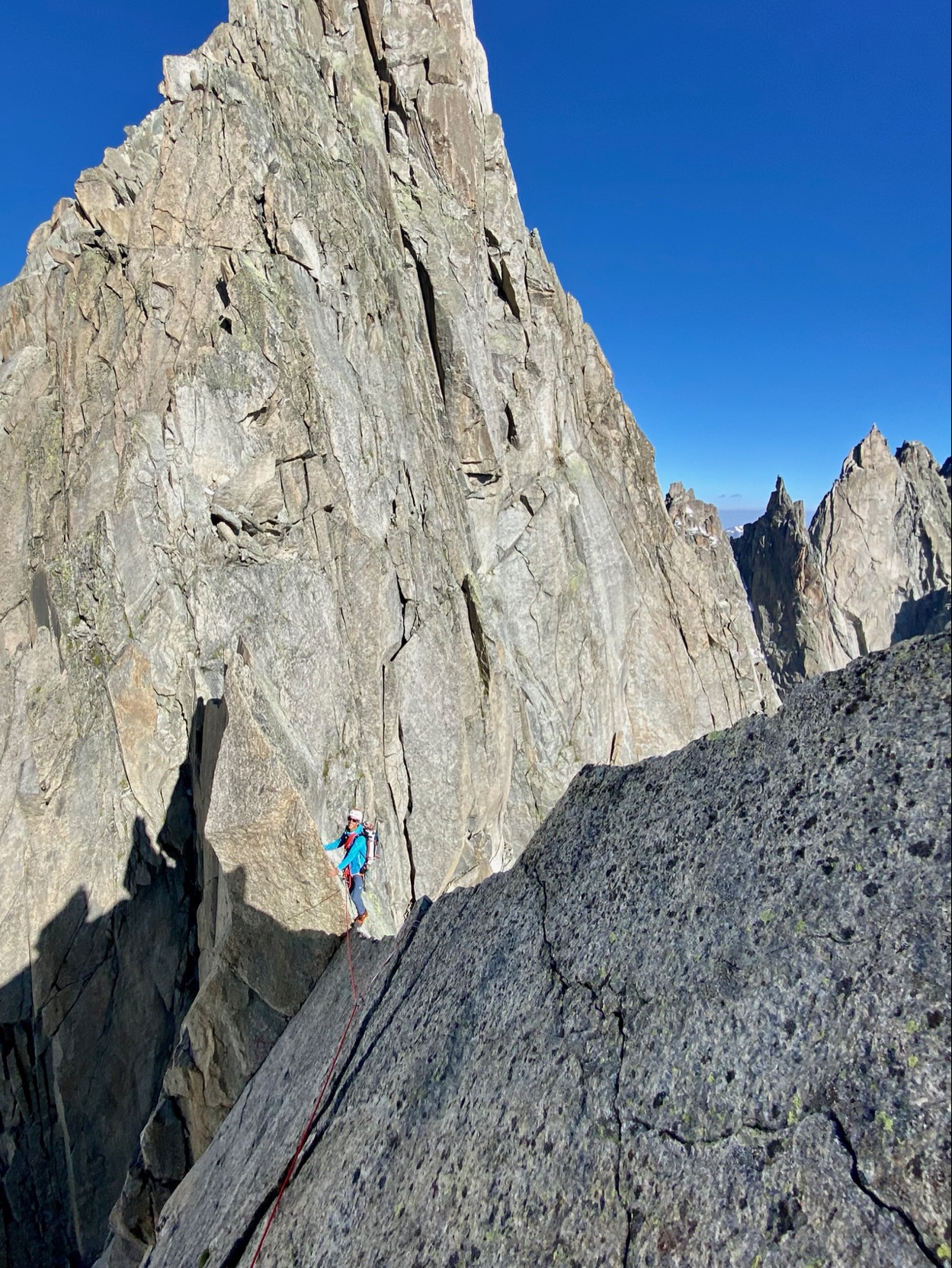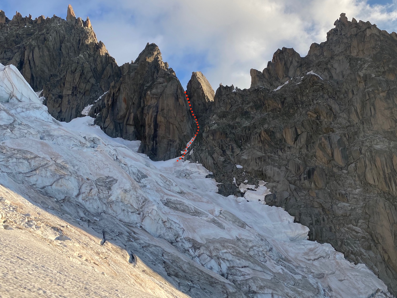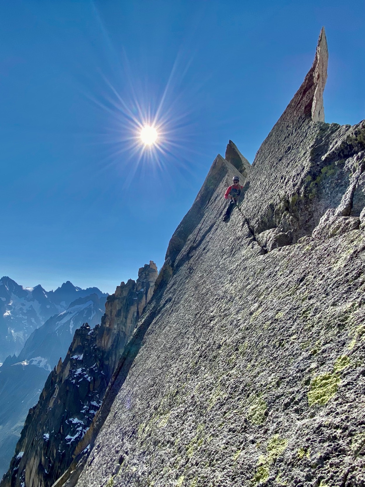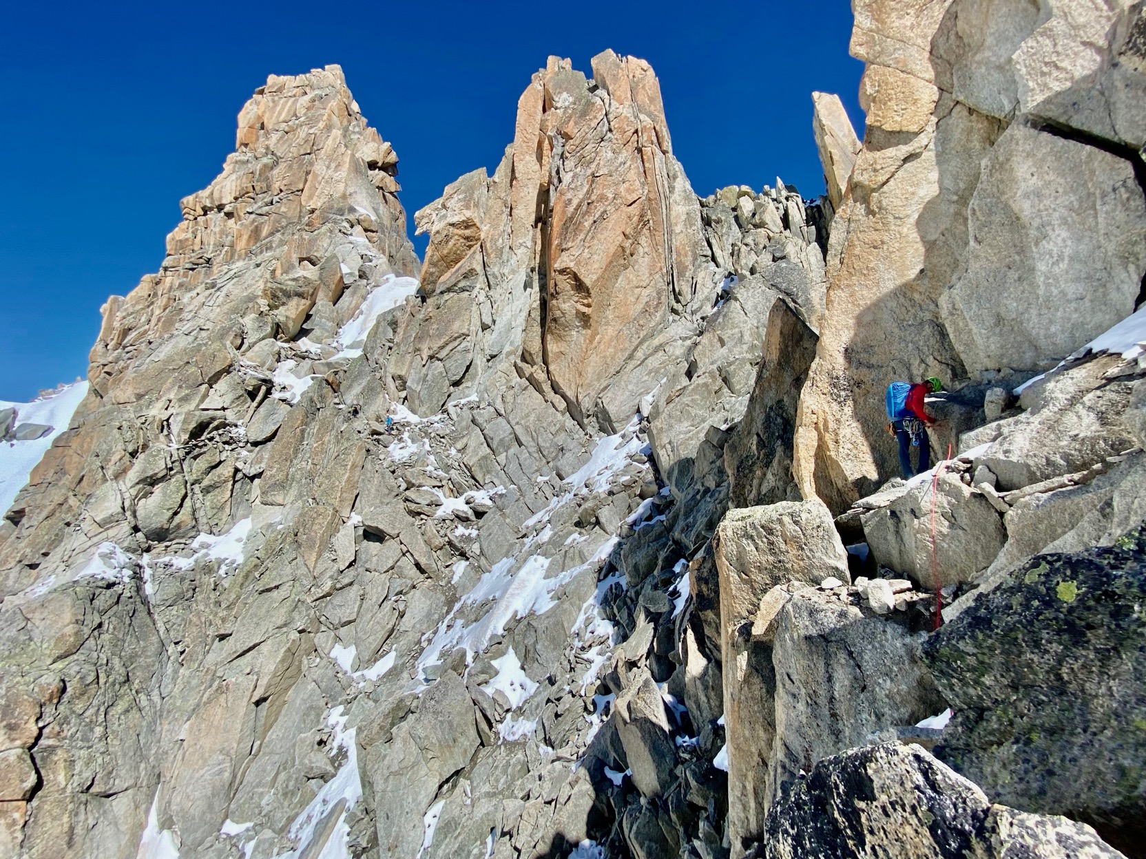 Nous apprendrons qui Julien « pica » Herry est lui aussi sur l’arête avec un client, épaulé par un deuxième guide, Paul Verdier. Ils on quant à eu proposé une vision bien plus intéressante de la course : au départ du refuge du Requin, ils on grimpé une voie rocheuse dans la face Est de l’aiguille du Requin (la voie Renaudie peut être une belle option) , et poursuivi sur notre itinéraire du jour avant de bivouaquer sur l’arête.