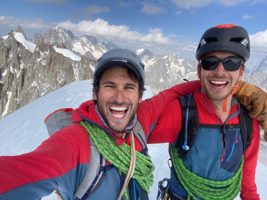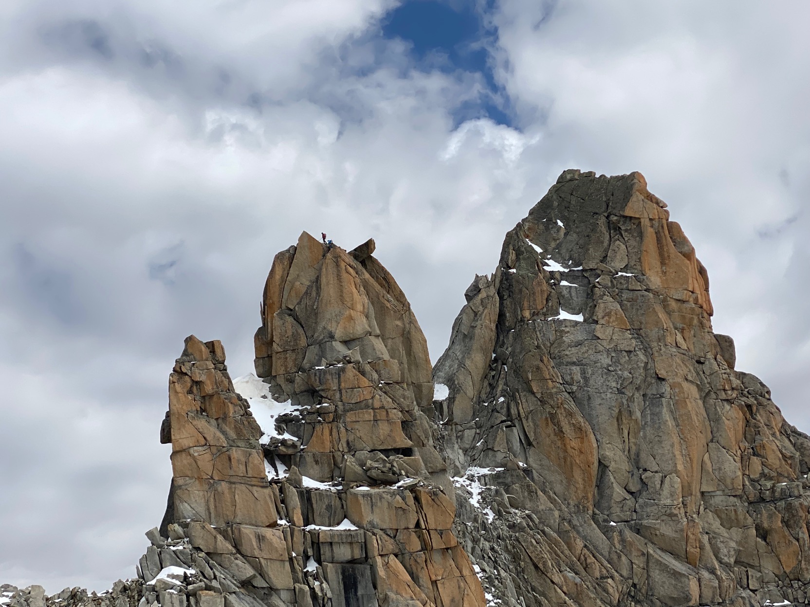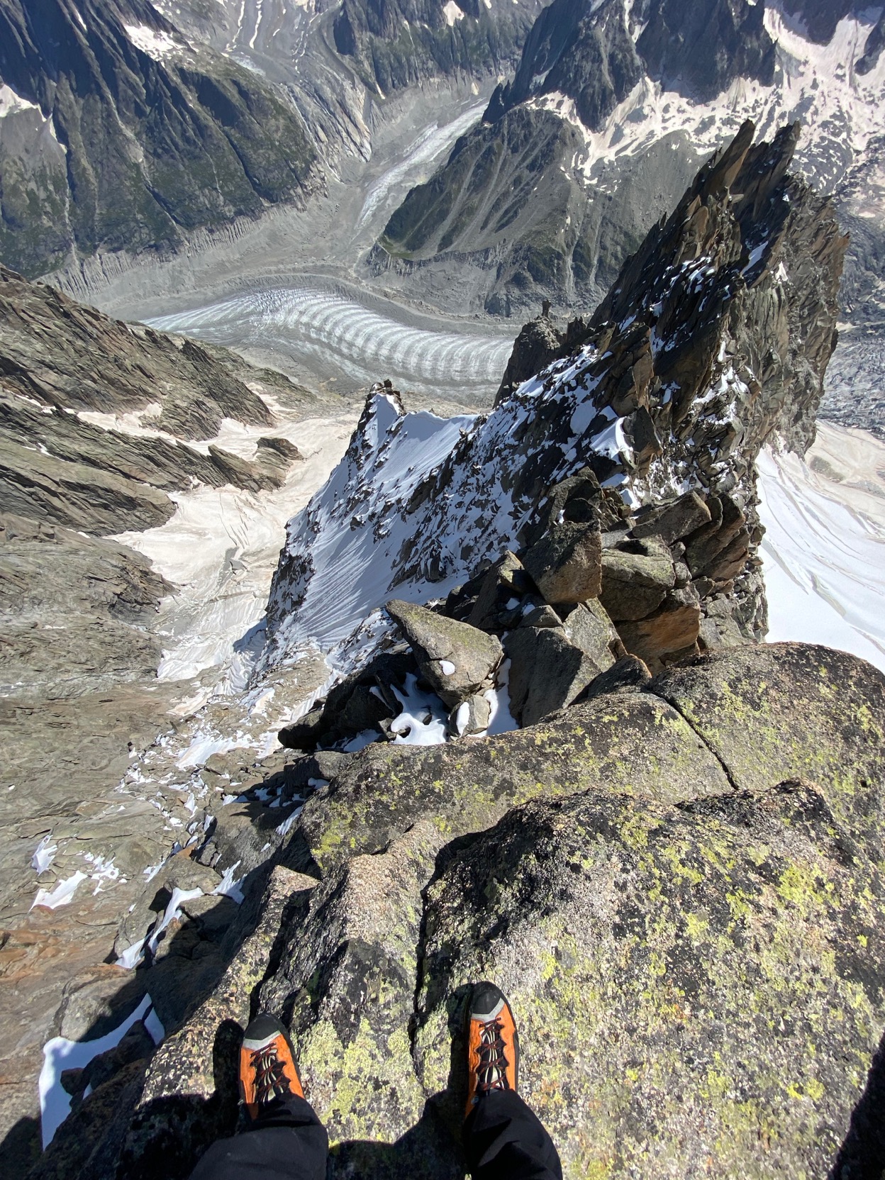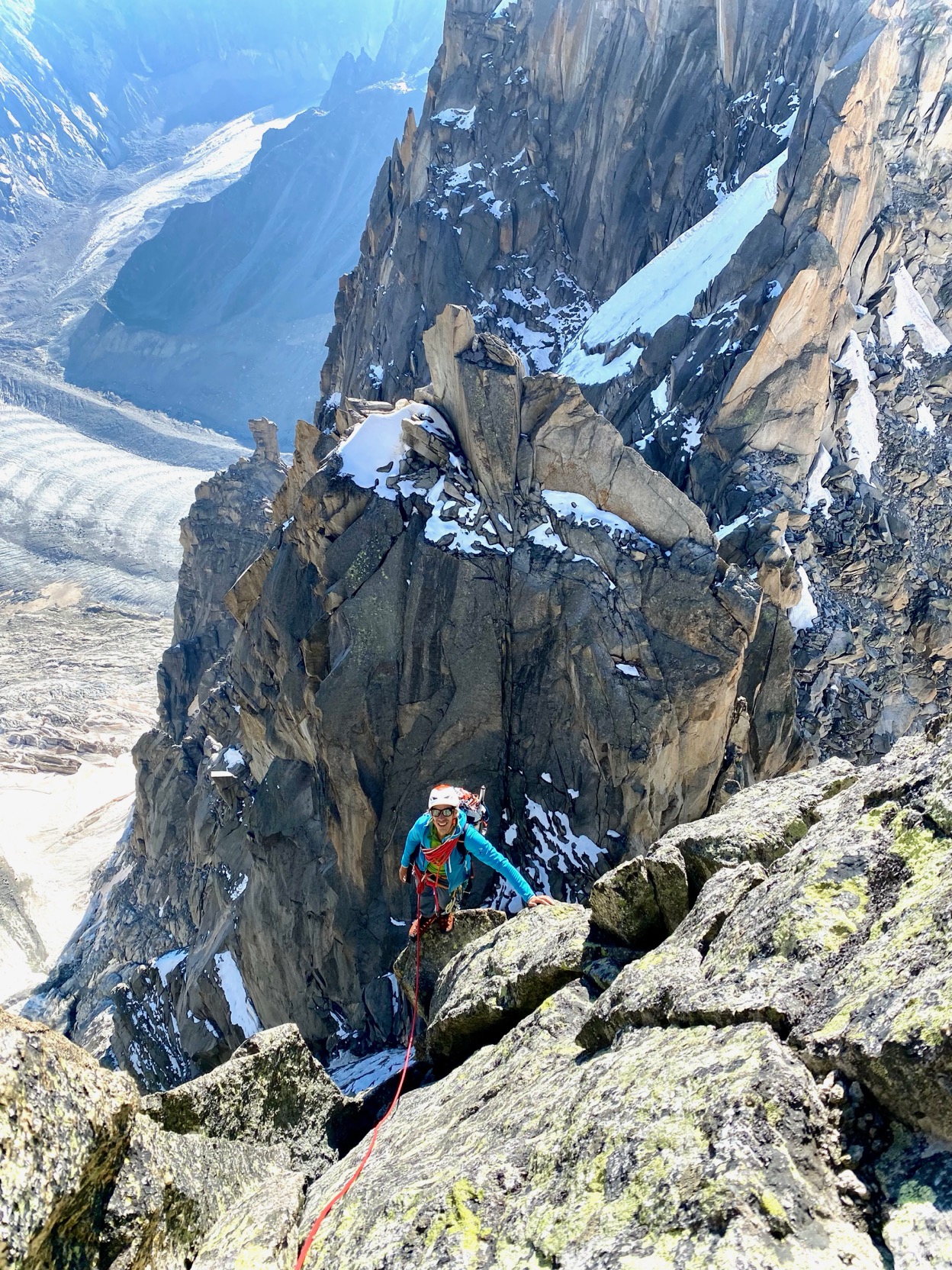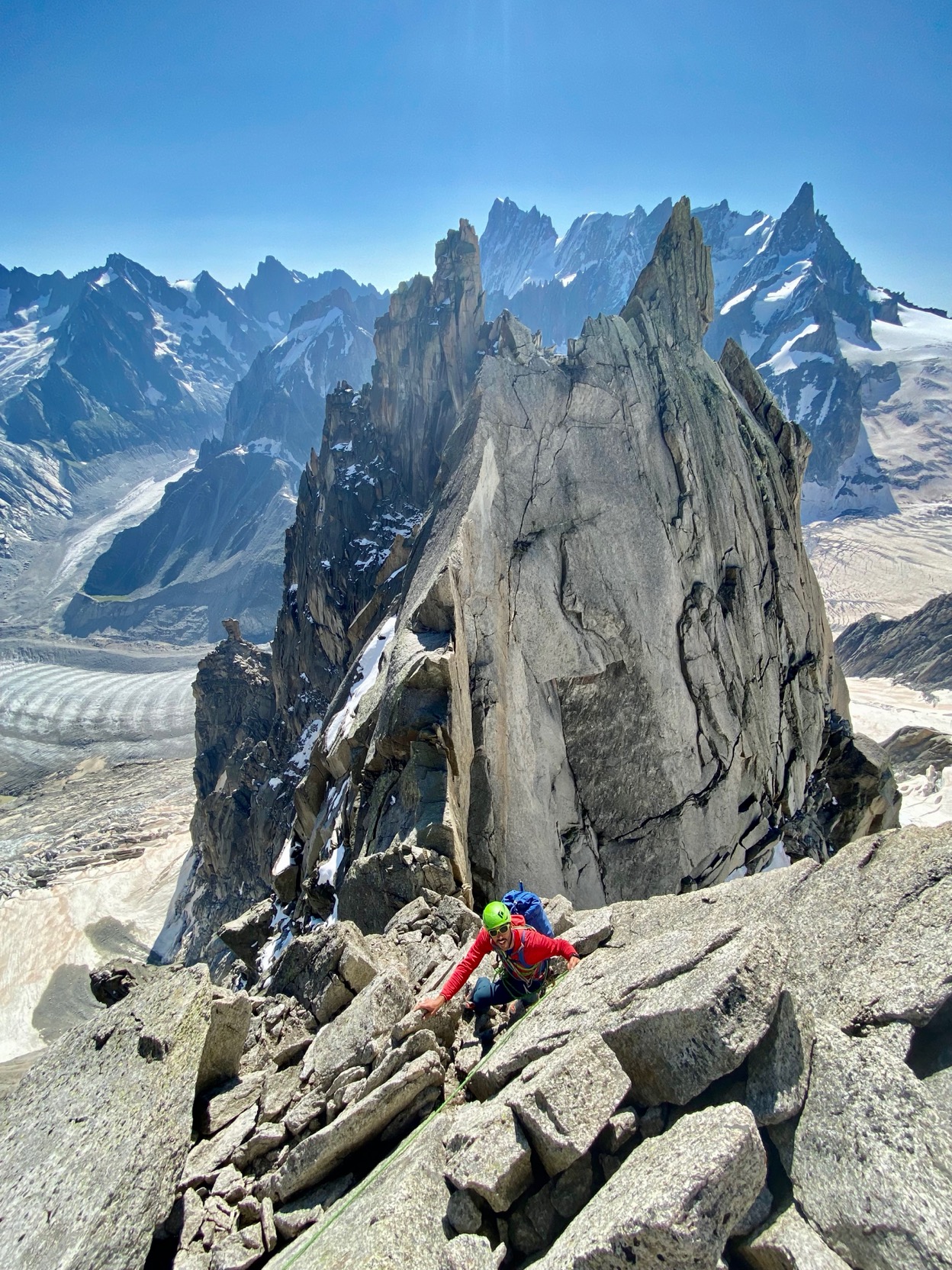 Nous apprendrons qui Julien « pica » Herry est lui aussi sur l’arête avec un client, épaulé par un deuxième guide, Paul Verdier. Ils on quant à eu proposé une vision bien plus intéressante de la course : au départ du refuge du Requin, ils on grimpé une voie rocheuse dans la face Est de l’aiguille du Requin (la voie Renaudie peut être une belle option) , et poursuivi sur notre itinéraire du jour avant de bivouaquer sur l’arête.