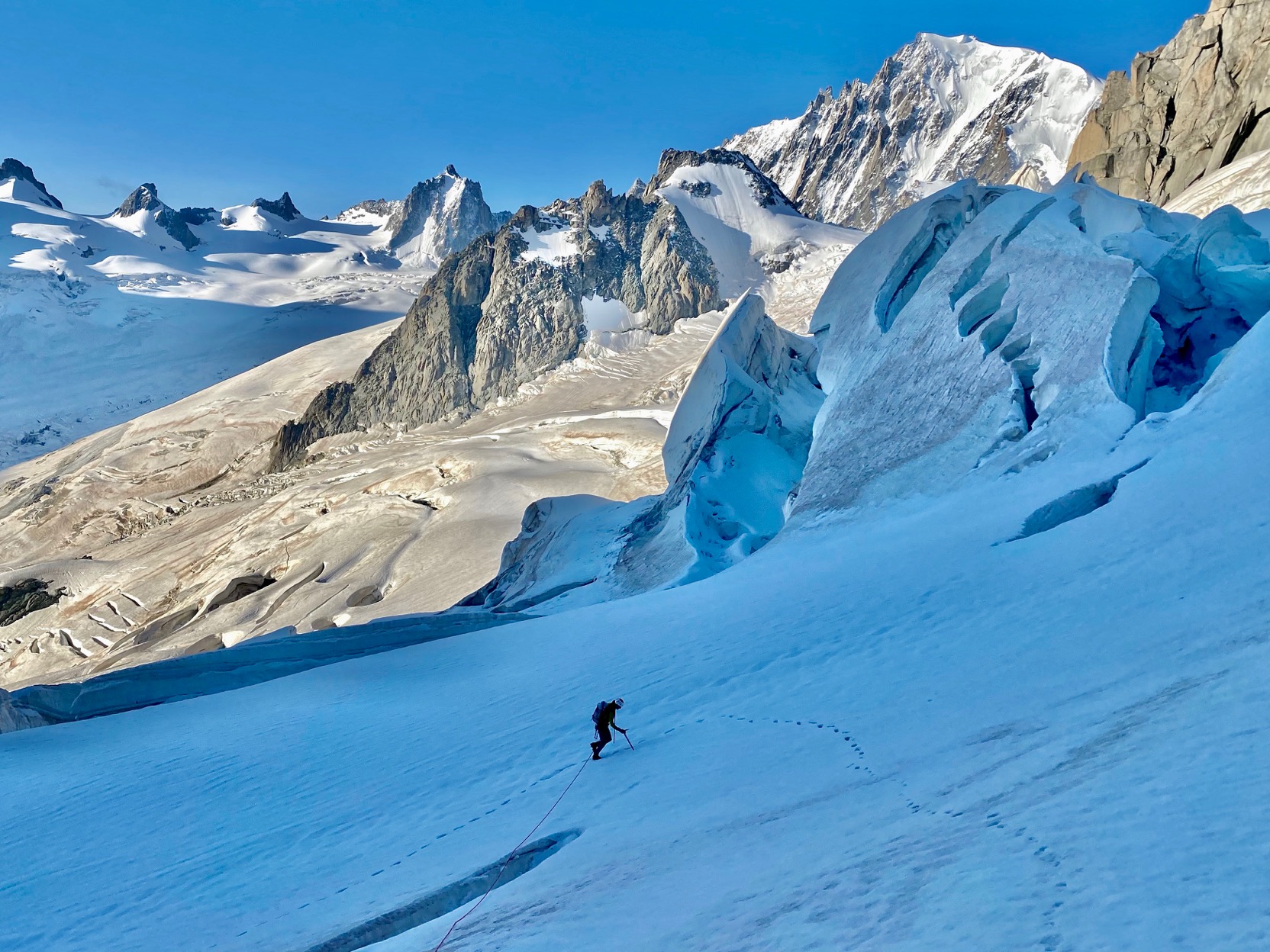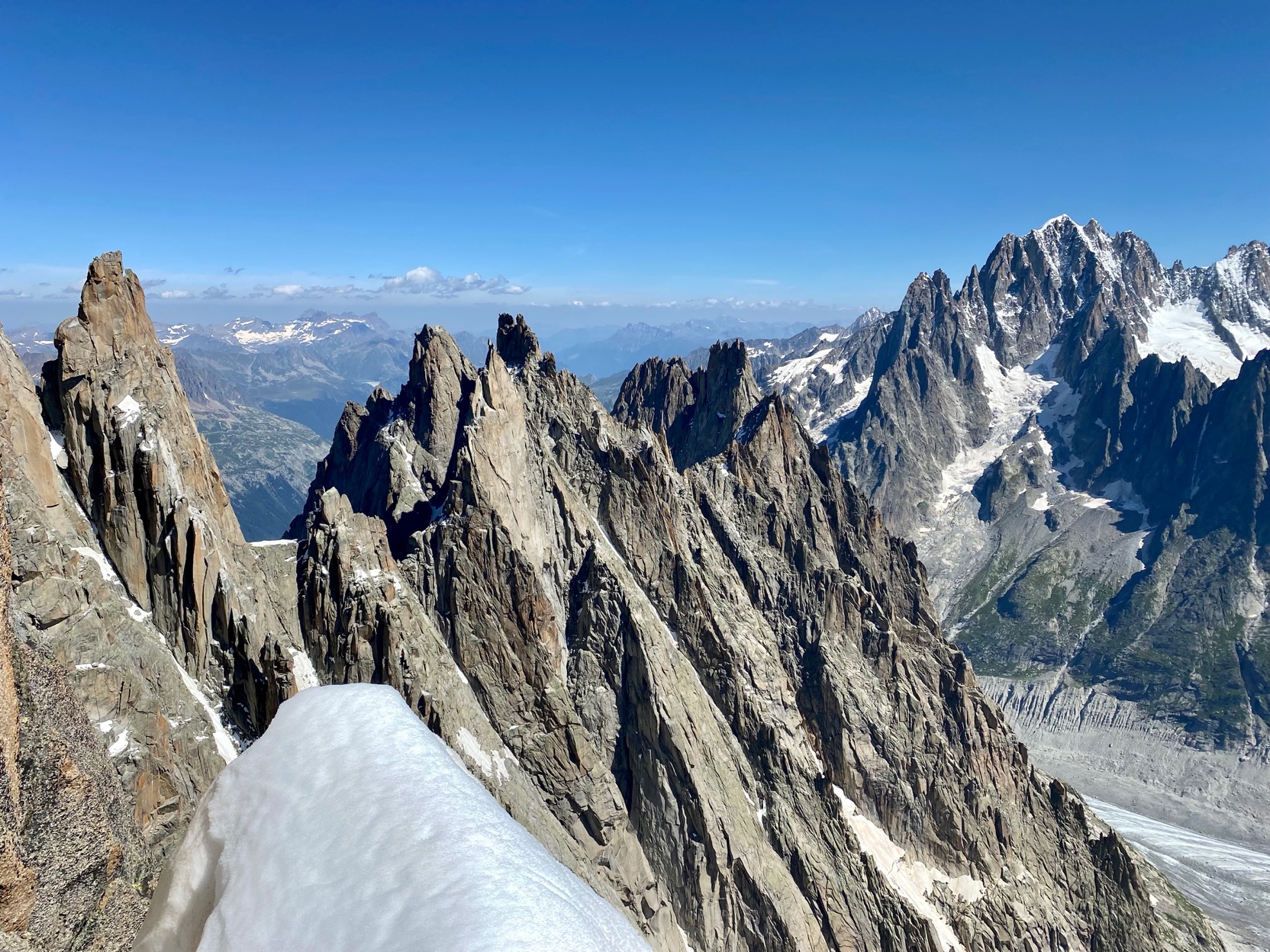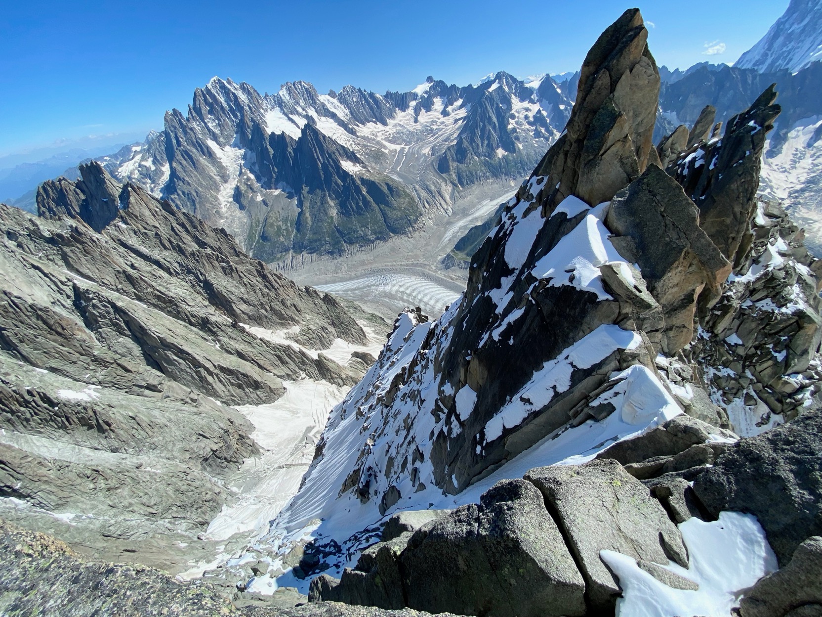 L’ambiance est grandiose, on surplombe les raides goulottes de la face Nord du Requin, et au loin un mer de glace qui ressemble encore à quelque chose !