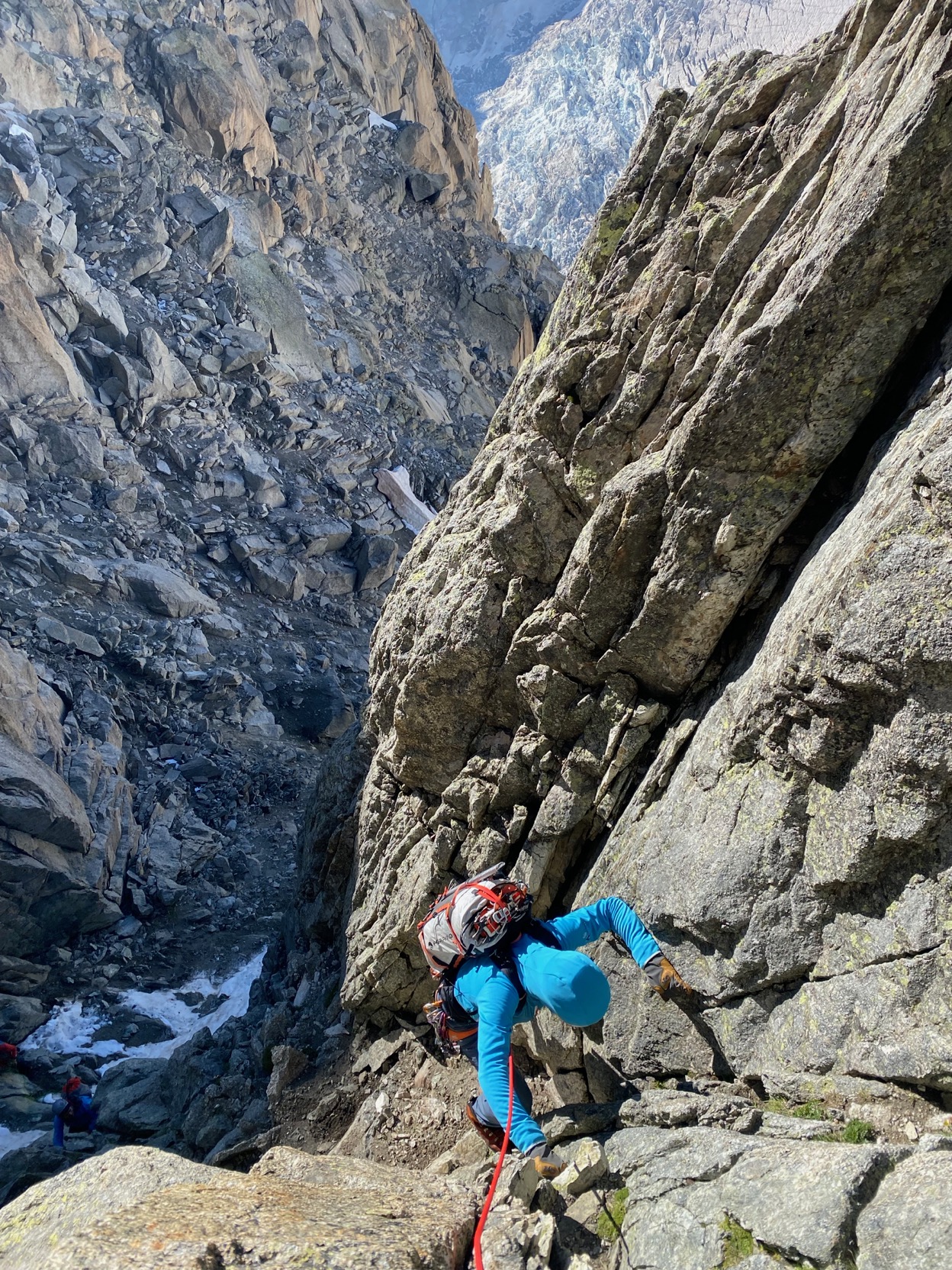 L’ambiance dans le couloir d’accès est plutôt délitée, nous essayons d’y passer le moins de temps possible et surtout ne pas s’envoyer des blocs instables les uns sur les autres. Une fois que l’on est dans la branche de gauche, le rocher s’assainit jusqu’à devenir excellent lorsque l’ on prends pied sur l’a