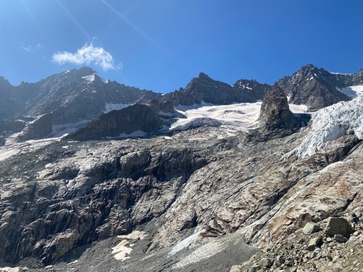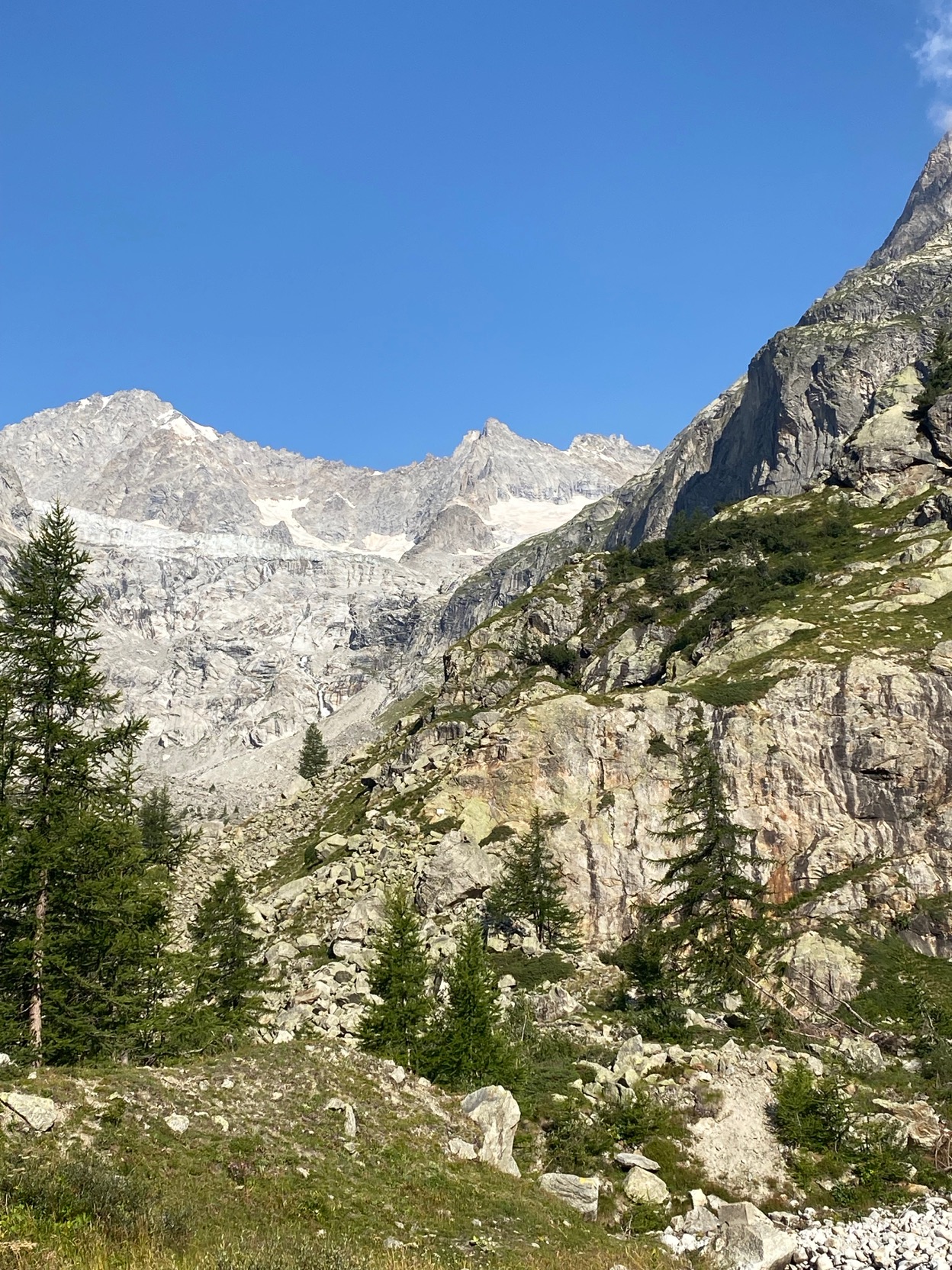Le lendemain nous repartons direction la vallée en passant au pieds des belles voies de la Paroie des Titans, sur les contrefort des mont rouges de Triolet.