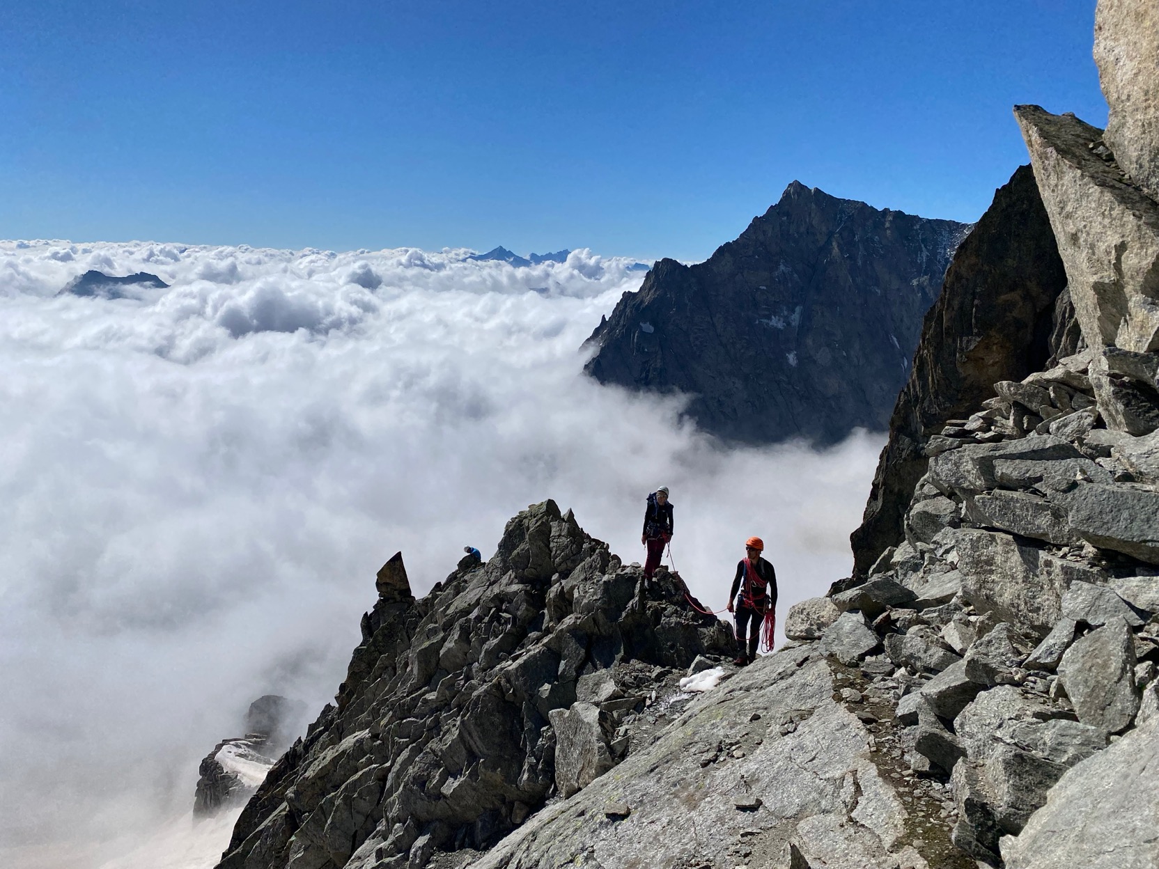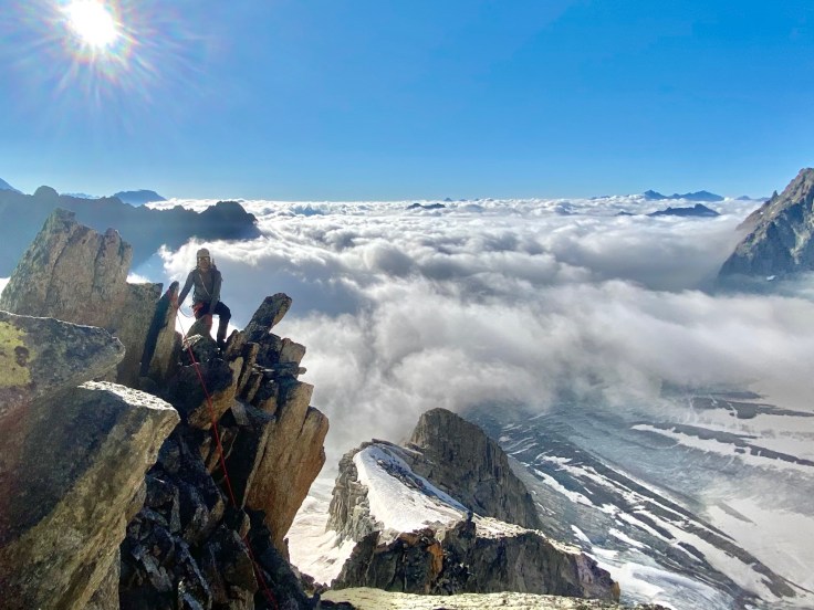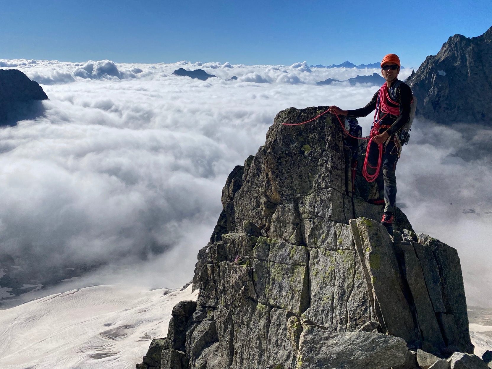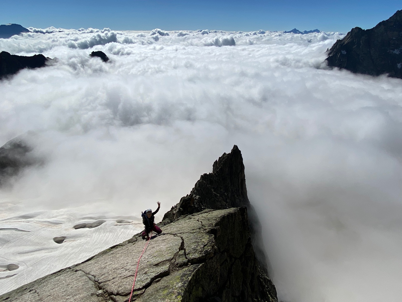 Une sublime mer de Nuages s’offre a nous. Le rocher est excellent, les fours a cristaux sont malheureusement déjà tous vidés. Les difficultés raisonnables et le cheminement évident sur le fil nous permettent de laisser le Topo dans la poche et d’avancer en mode pilote automatique…
