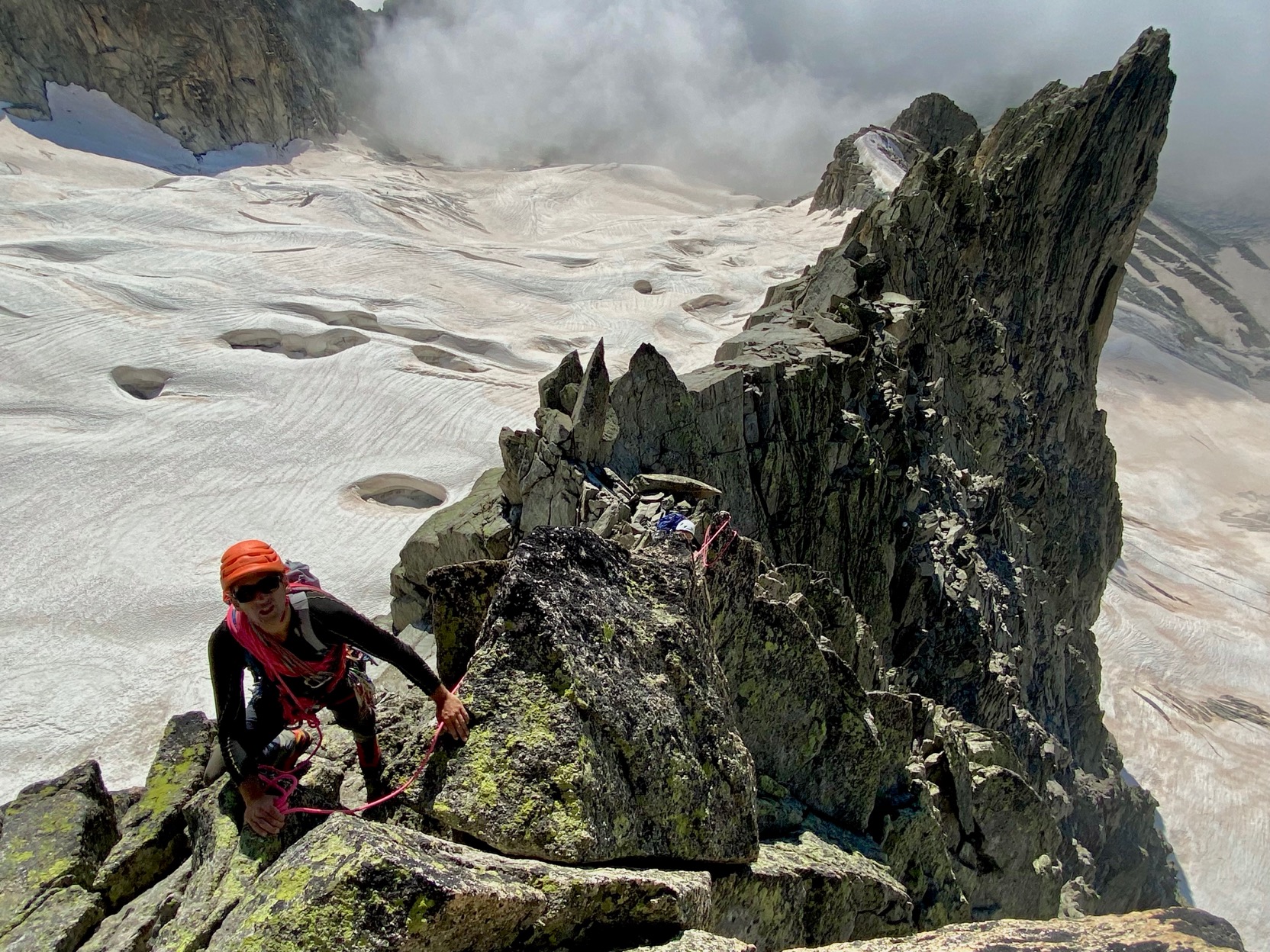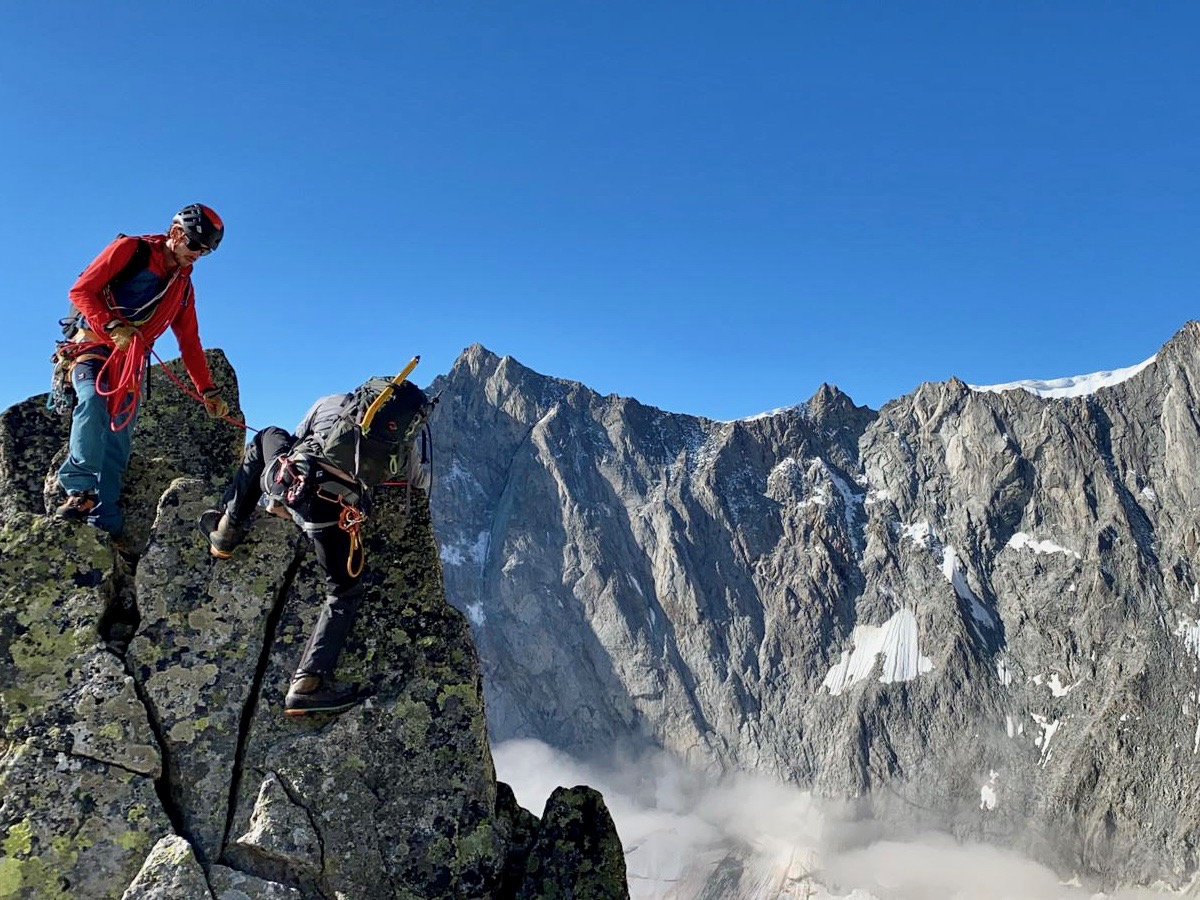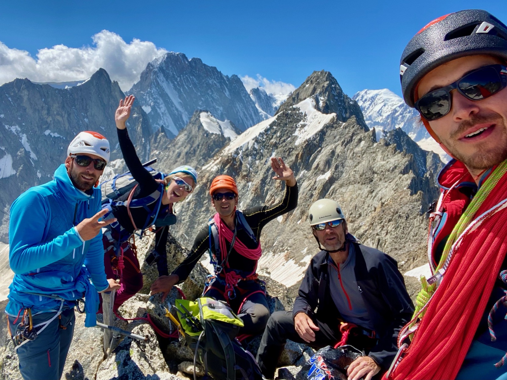 A l’occasion de la semaine d’application du Stage Final du Guide, nous avons eu l’occasion avec Pierre Boucher et Sylvain Prebet, de guider nos clients Hubert, Fernanda et Christian sous la supervision de Charles Noirot, sur cette belle arête dans le sauvage cirque glaciaire de Triolet.