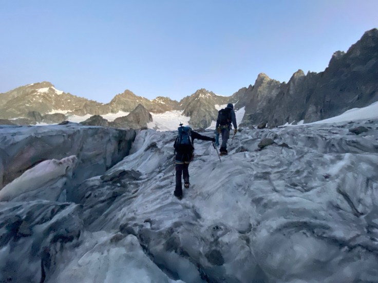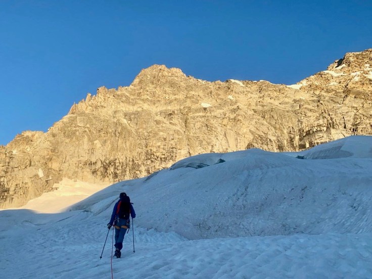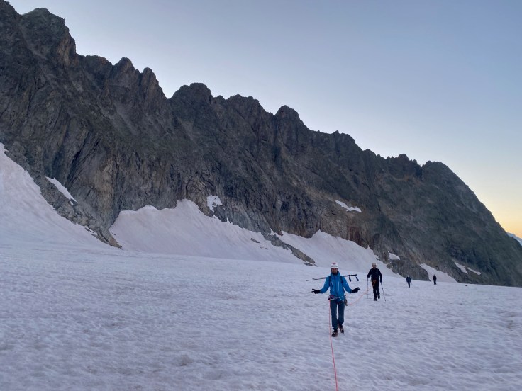 Un départ du refuge à 5h00 du matin nous permettras de prendre pied sur le glacier aux lever du jour, la saison étant bien avancée nous sommes ravis d’y voir clair pour trouver le meilleur cheminement pour nos clients.