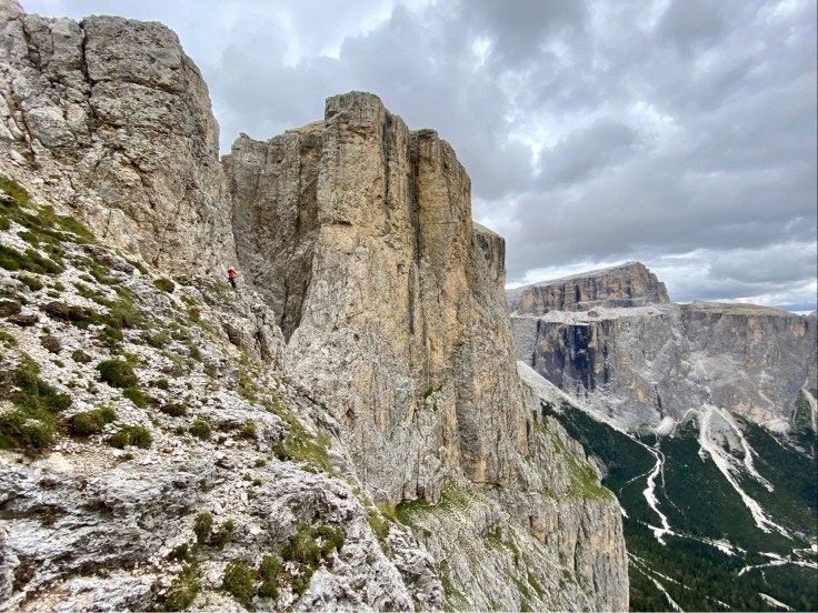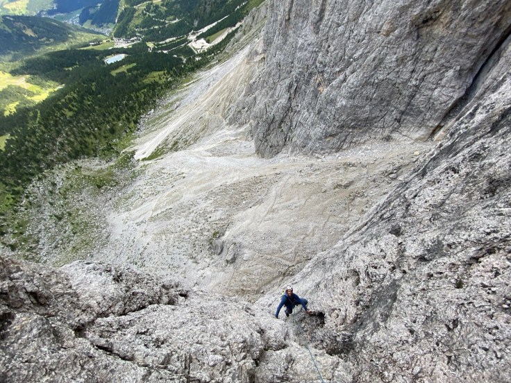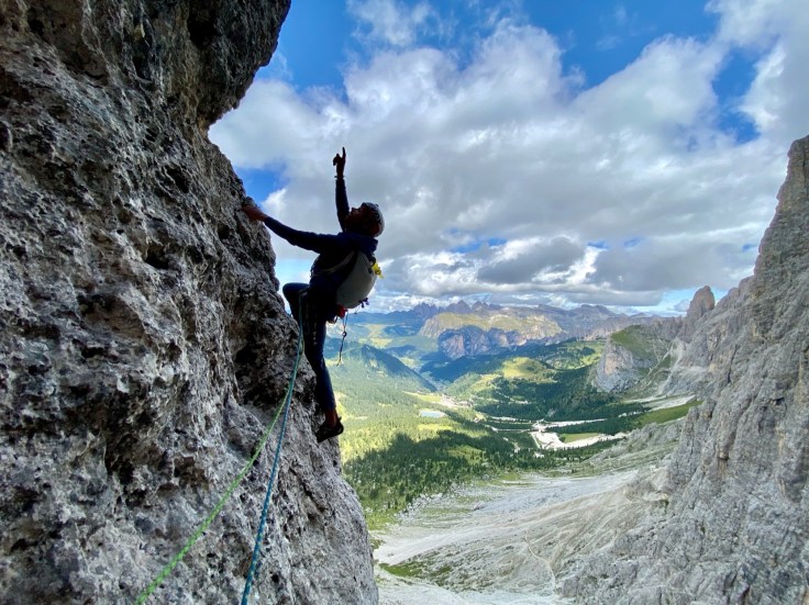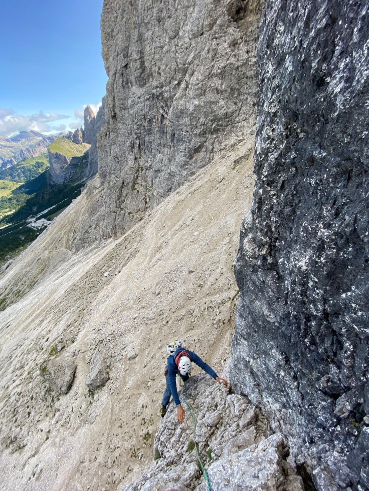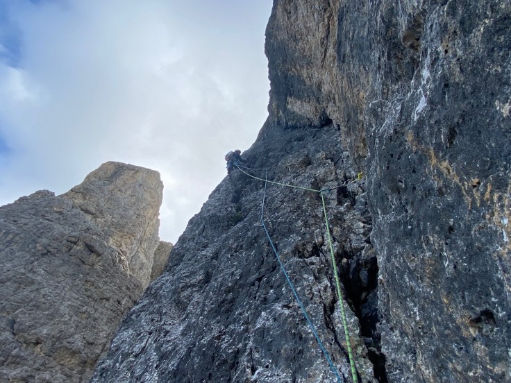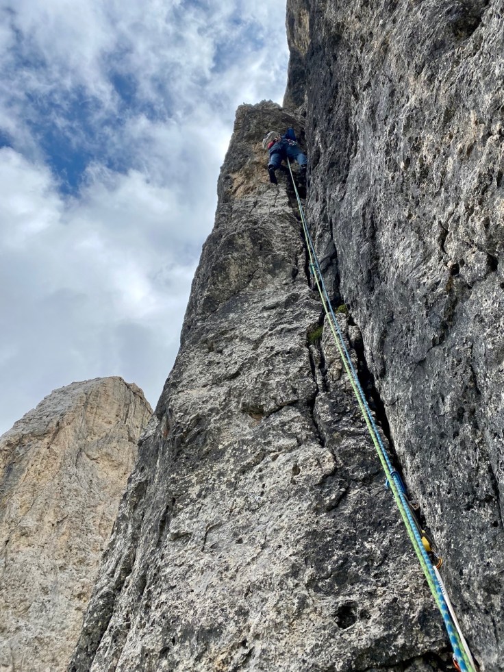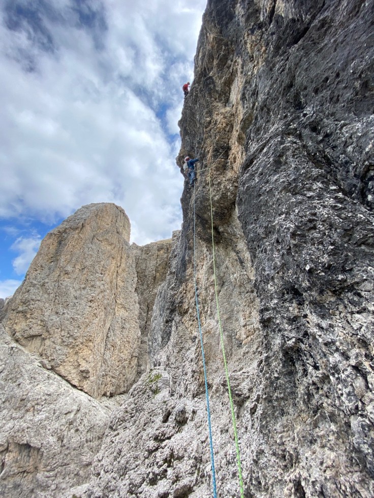 Nous nous répartissons sur la deuxième tour de Sella entre la voie Messner, et la voie Lelia. Avec Pierre, Christophe et Quentin, nous partons dans la voie Lelia. Au pied du mur, l’ouverture par la cordée Glück/Rezzara en 1936 nous laisse songeurs.