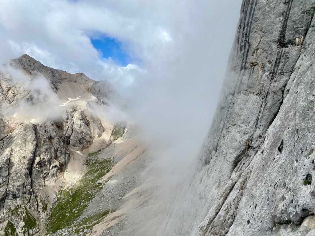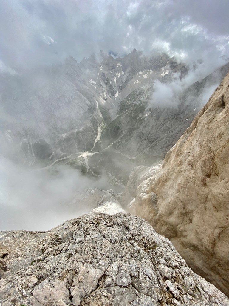 Seulement voilà, ce qui devait arriver arriva, avec l’arrivée du soleil sur la face un épais brouillard s’est installé. L’ambiance tant désirée de face sud est à mettre aux oubliettes ! Et c’est partit pour une belle face Nord de la Marmolada…