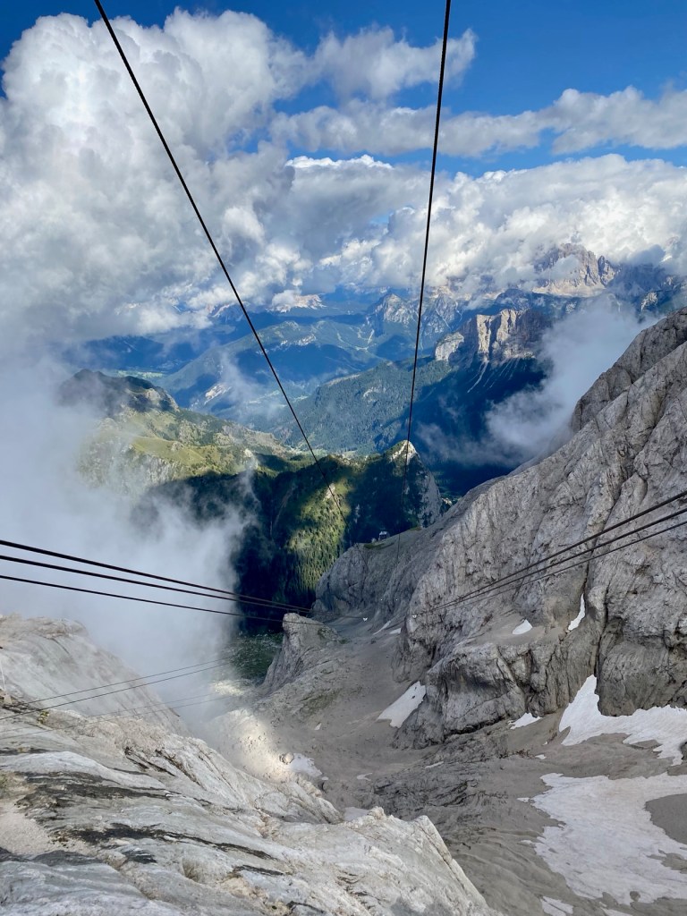 on prends pied sur le glacier à 16h25, et un petit sprint à 3200 m nous attends pour rejoindre la gare sommitale de la Marmolada. 3 minutes qui suffisent à nous mettre le gout du sang dans la bouche, et à voir tout trouble à l’arrivé… Mais on rentrera pas à pied !