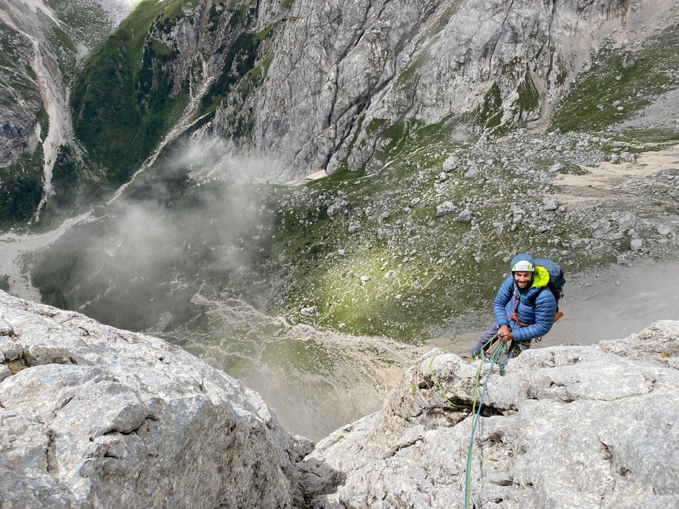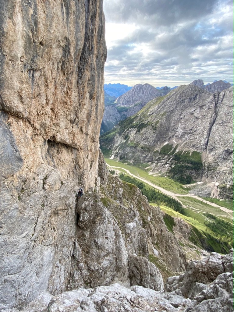 la troisième longueur de ce ressaut s’avèrera être particulièrement marquante. Typique des voies dures de la Marmolada nous avouera Philippe Batoux, où les prise et protection n’apparaissent qu’au dernier moment, et où il faut avoir le mental bien accroché. Au ressenti c’était un bon 6b, sans prendre en compte le serrage de fesse inhérent à ce genre d’escalade.
