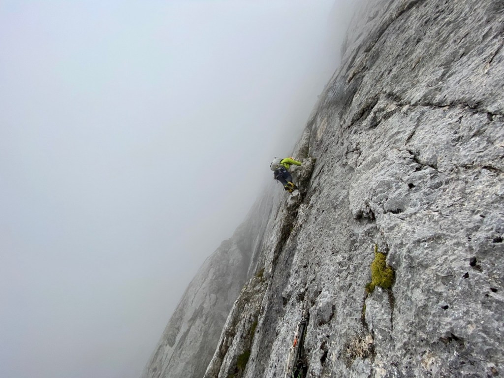 Forcément à 4 cordées butant devant un resaut difficile, un petit embouteillage se crée, et nous avons bien le temps en queue de peloton de profiter des rares éclaircie pour laisser notre esprit voguer dans cet océan de dalles calcaire.