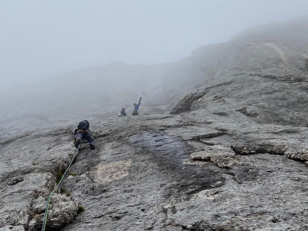 La grimpe y est exigeante au niveau de la recherche d’itinéraire, surtout avec ce brouillard qui décidément ne nous aura pas lâché de la journée.