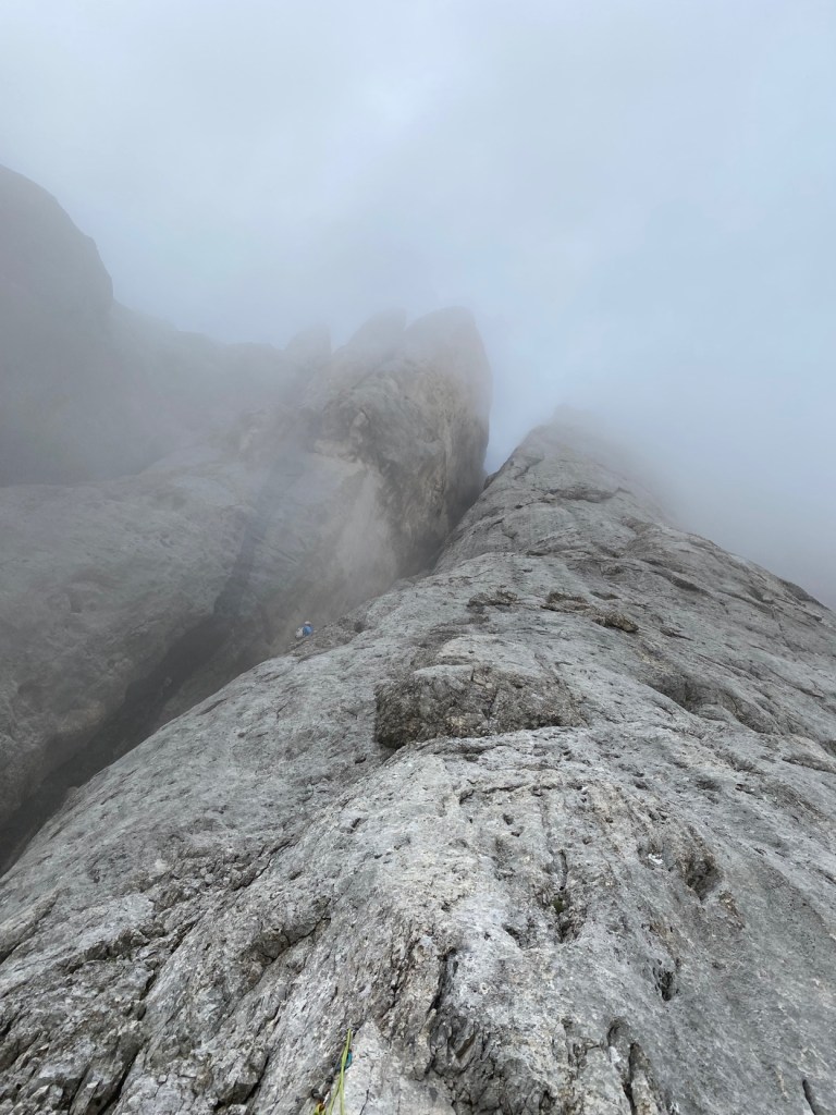après 2 ultra-longueurs nous apercevons de nouveau nos camarades, sur le piler sommital dont le sommet se perds dans les nuages